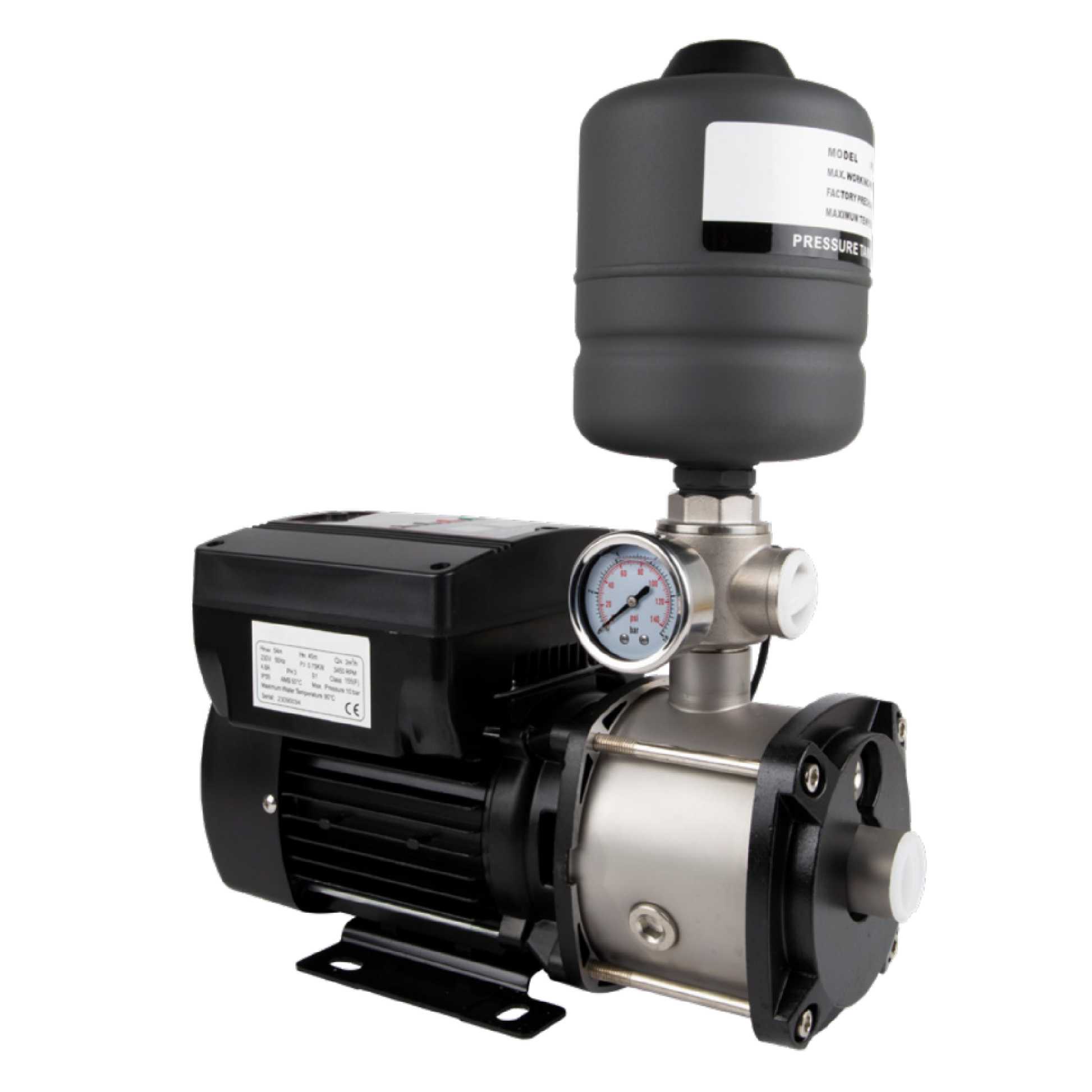 Variable Frequency Pressure pumps is suitable for all kinds of water plants; pressure stations; hotels; residential areas; and other high rise buildings. Very popular to customers for high volume conditions. Energy saving and efficient pump that will only supply demand as when needed; saves from 20 percent to 50 percent. Easy to set Variable Speed Drive ensures a constant pressure by regulating the speed of the motor as the demand varies. Dry run protection included. Constant water pressure. This prolongs the service life of the pipe network. It can be accustomed to various environments and pump installations. Simple operation: fool style operation. All functions can be finished by a button; no need for professional staff to troubleshoot. Motor soft start; improving power factor and prolonging the service life of the water pump. The pump can work stably when the voltage range is 160V-250V. Highly integrated design; combining the inverter system; control and protection cooling and sensor system. The vessel ensures the pump can switch off if there are small leaks on the system. The air pressure must be maintained at 60 percent of set water pressure to ensure correct operation. Operation; performance is reasonable; the average torque and abrasion on the shaft is reduced because of the decline for average speed in one day; the life of pump will be longer. Because it can realize the soft stop and soft start of the water pump; it can eliminate water hammer effect (water hammer effect means direct starting and stopping; liquid kinetic energy of a sharp change; lead to the great impact of the network; there is a lot of damage).